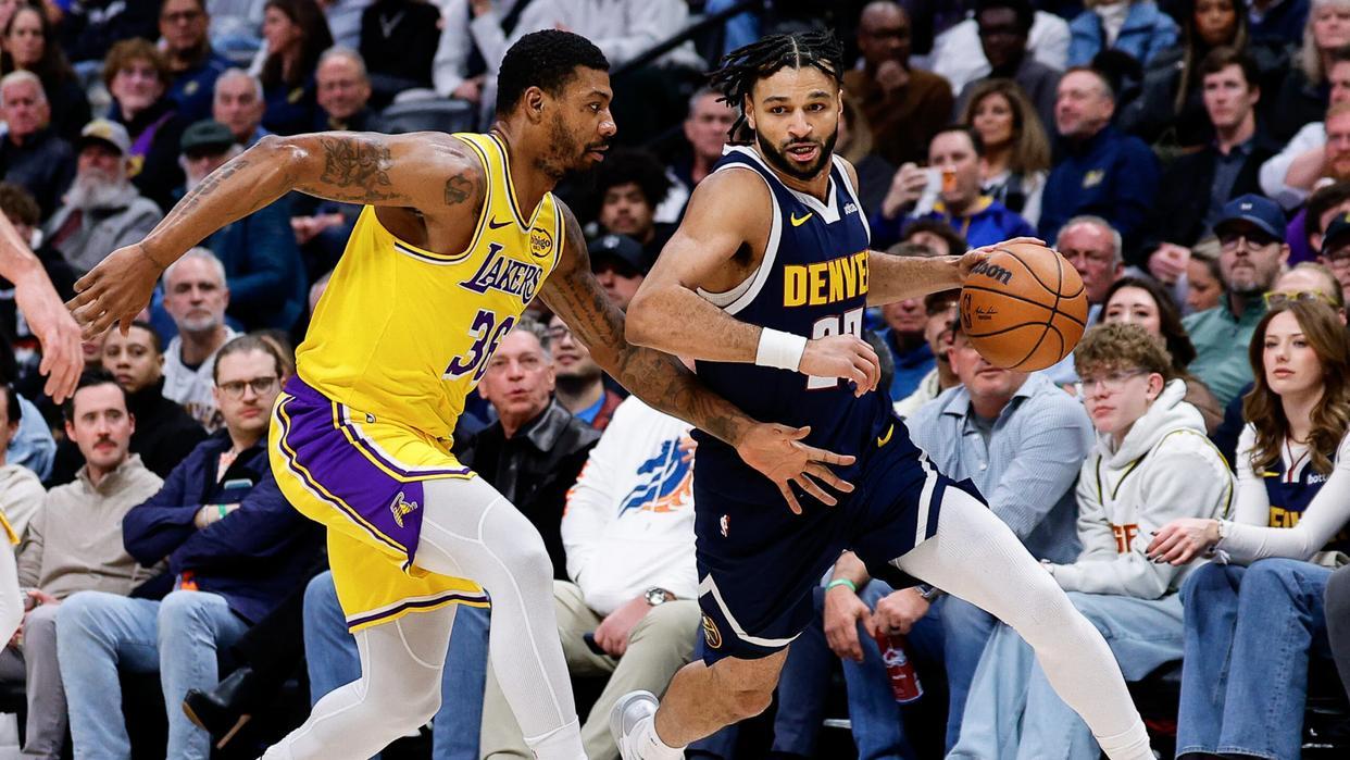 北京时间1月21日,NBA常规赛继续火热进行。湖人坐镇主场挑战掘金,两大宿敌的对决,充满了看点。此役,约基奇、瓦兰丘纳斯、卡梅隆约翰逊、布劳恩伤停,丹佛的首发五虎是穆雷、戈登、沃特森、皮克特与琼斯。内线人员轮换紧张的掘金,在此役面临着巨大的禁区防守压力。里夫斯伤停,湖人的首发五虎是詹姆斯、东契奇、艾顿、斯马特与拉拉维亚,八村塁继续担任替补。两大超人气球队,在此役上演了激烈厮杀。