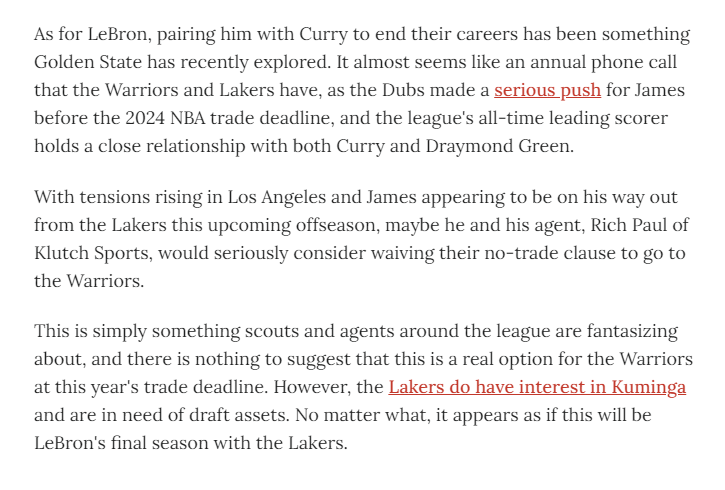 另外一位NBA记者布雷特·西格尔猜测勇士会继续追求詹姆斯,或许詹姆斯和库里会联手。西格尔提到,勇士和湖人每年都会进行例行通话,勇士曾在2024年交易截止日前全力追求詹姆斯,而这詹姆斯与库里和德雷蒙德·格林都保持着密切关系。随着湖人内部紧张局势升级,詹姆斯似乎已注定将在即将到来的休赛期离开湖人,或许他和他的经纪人会认真考虑放弃交易否决权加盟勇士。